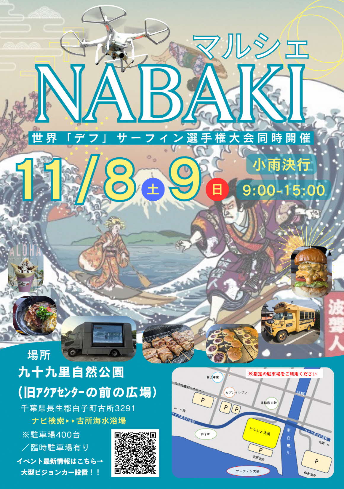 世界デフサーフィンチャンピオンシップと同時開催で、NABAKIマルシェも開催されます!ステージ発表やワークショップ、40店舗以上のグルメが大集結します!大型ビジョンカーも設置され、サーフィン観戦も同時に楽しめる「サーフ&