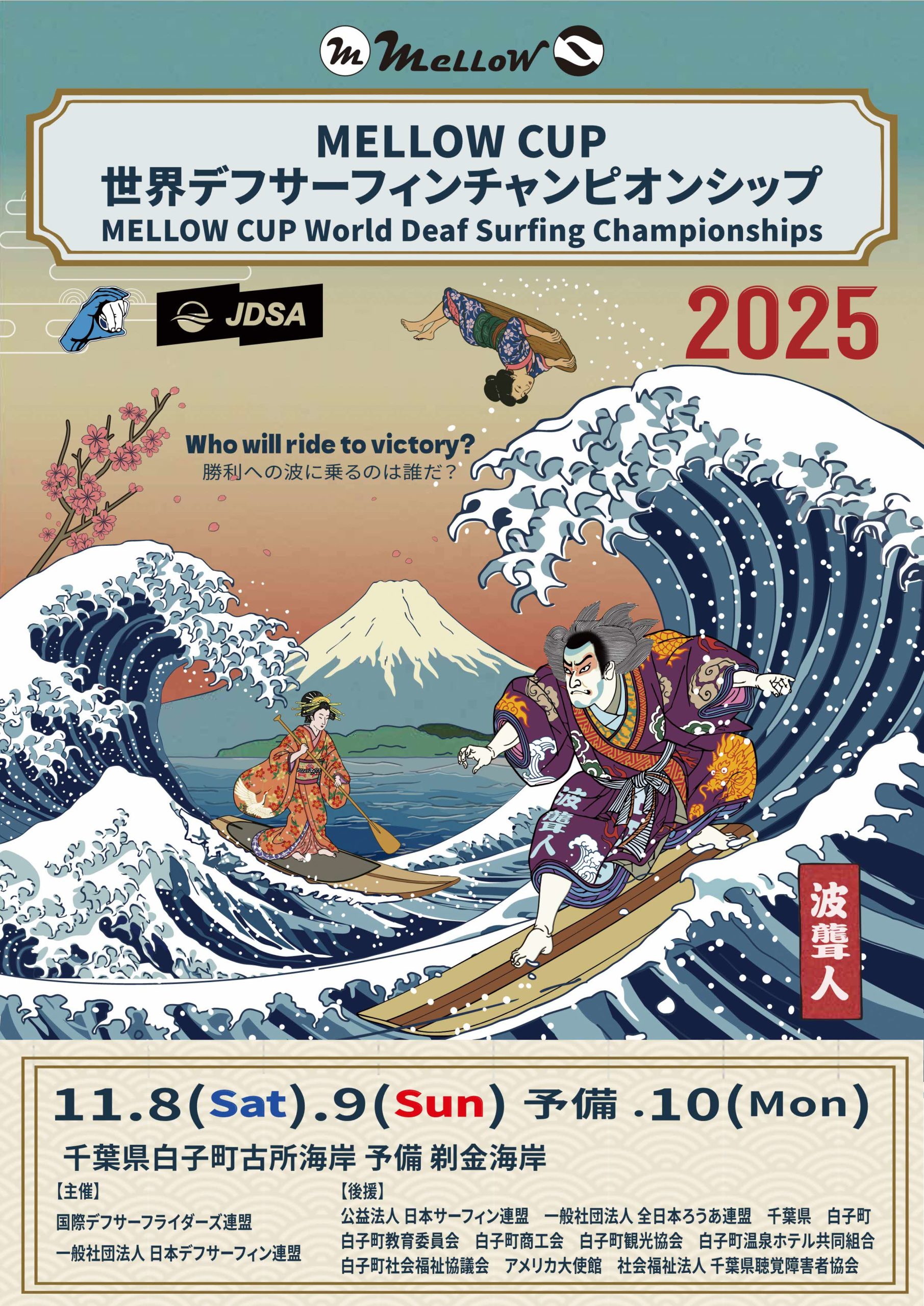 世界デフサーフィンチャンピオンシップが白子町で開催されます! アメリカ、オーストラリア、フランス、ブラジル他5カ国以上の選手たちが白子町に集まり熱い戦いを繰り広げますので、皆さんも一緒に応援してください!!※「デフサーフ